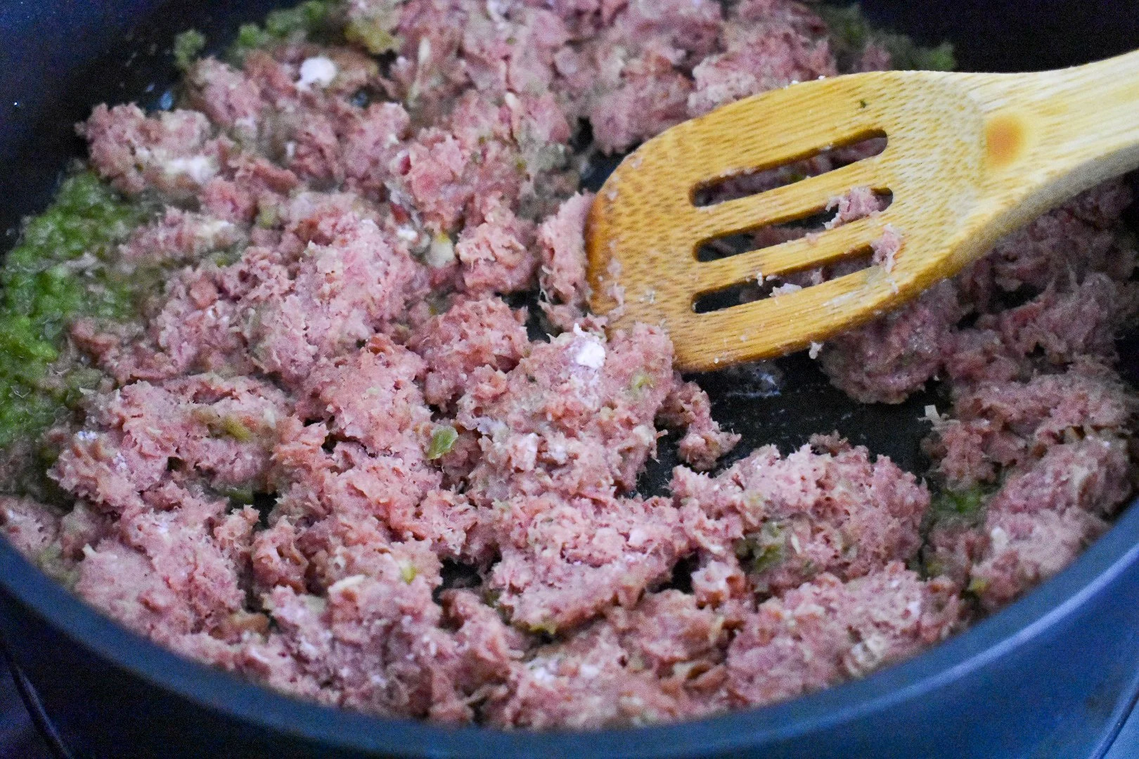 Normally, the fried sweet plantain is formed into a large ring, held together by toothpicks while cooking, stuffed with the beef filling, and topped with a creamy, melting cheese. The picadillo-style filing is traditionally made with ground beef, but in our family, we used corned beef instead for an extra hit of flavor that pairs nicely with the sweet plantain. That sweet and salty combo is always amazing!